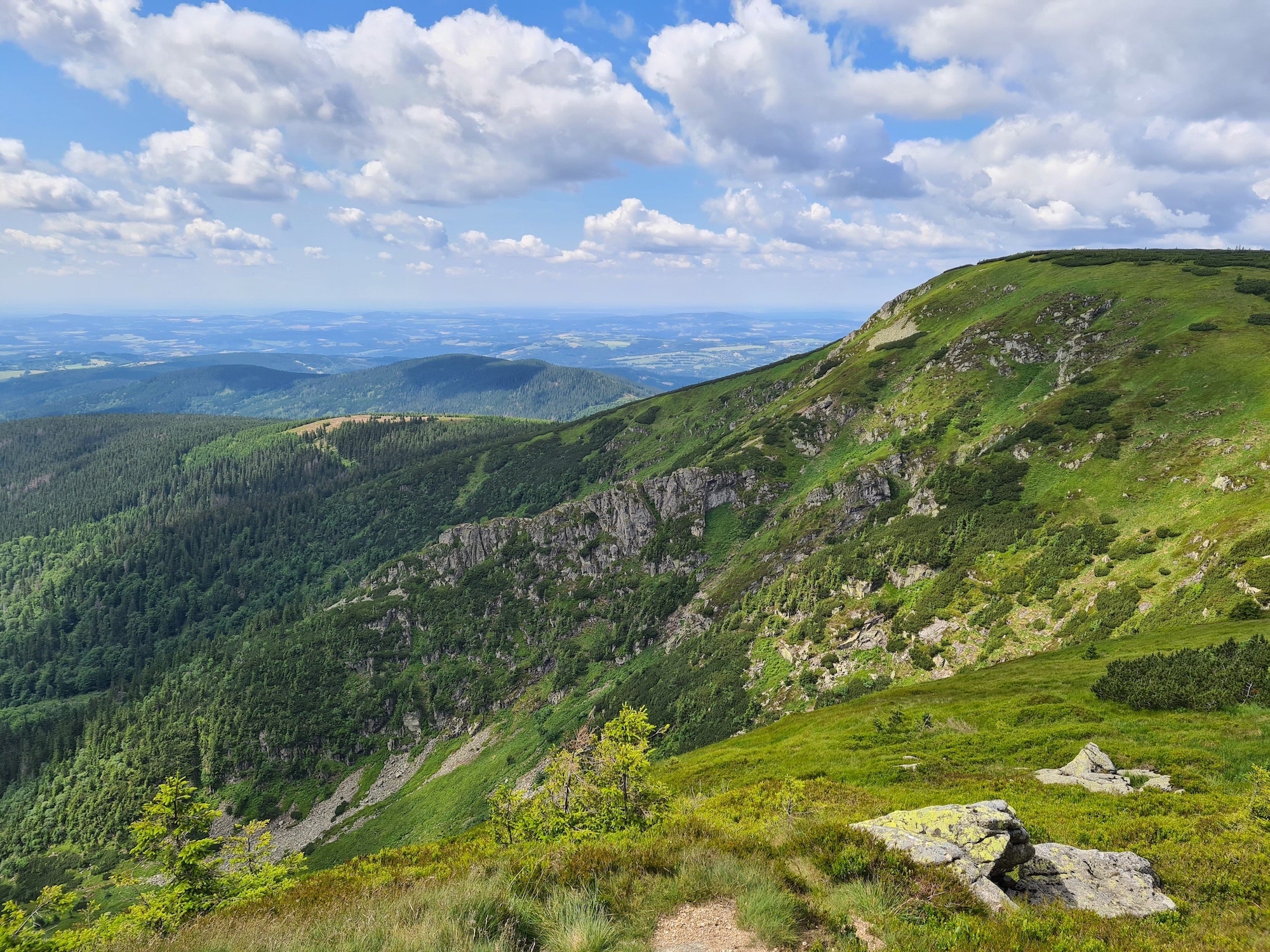 Suivez le chemin rouge depuis Špindlerův Mlýn jusque Vítkovice. Prenez le chemin jaune jusque la borne SK 090. Faites un détour via le chemin vert jusque la roche Harrachovy kameny avec vue sur deux ravins (Velká Kotelní jáma et Malá Kotelní jáma). Marchez jusque la source du fleuve Elbe (Pramen Labe), un des principaux fleuves en Europe, via le chemin rouge. Il y a là des tables de piquenique. Continuez la route vers le Nord via le chemin jaune. Marchez le long de la frontière entre la République tchèque et la Pologne (chemin rouge). Arrivez à plusieurs points de vue sur un renfoncement de la montagne du côté polonais (Wielki Śnieżny Kocioł). Rebroussez chemin et suivez les marquages jaunes pour débuter la descente dans la vallée. Ajoutez 1 kilomètre pour voir la chute d’eau Pančavský vodopád ( la cascade Pancava que je l’ai loupée) et descendez de Labská boud jusque Špindlerův Mlýn via le chemin bleu. Vous suivrez la rivière qui creuse la vallée, ponctuée de quelques arrêts avec points de vue sur des chutes d’eau (notamment Labský vodopád).