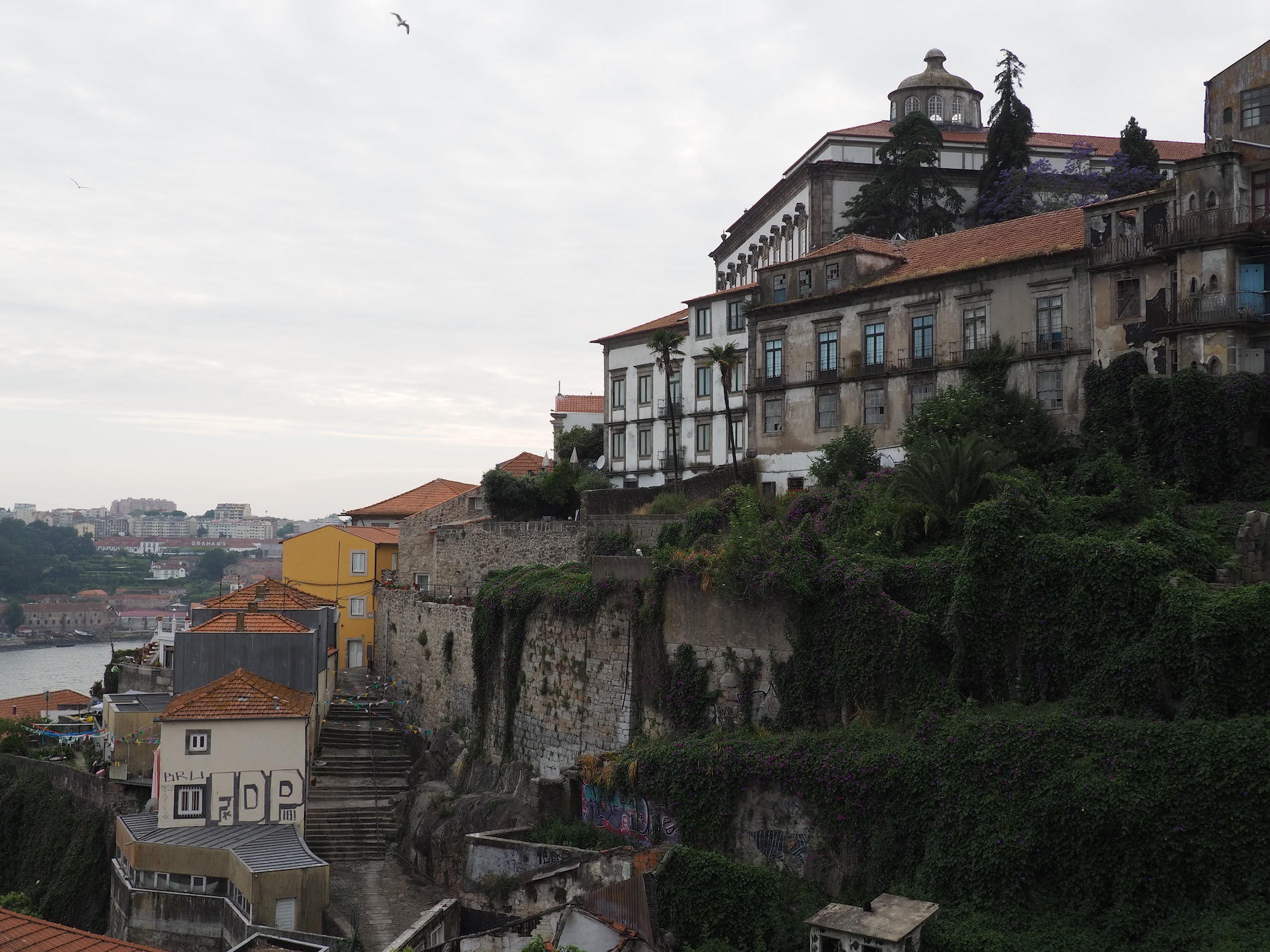 Prendre l’air et nous dégourdir les jambes était nécessaire après l’ingestion de l’alcool local. Nous gravissions alors les rues menant au Jardim do Morro et au point de vue Miradouro da Serra do Pilar. De là, nous traversions à nouveau le Douro, via le niveau supérieur du pont Dom Luis. Les murs, toits et façades qui nous accueillaient de l’autre côté du fleuve étaient recouverts de fleurs et de verdure. Finalement, nous arrivions aux alentours de quelques lieux touristiques: l’église de Santa Clara, la tour des Clercs, la cathédrale de Porto et l’église Saint-Ildefonse. Nous décidions de ne pas visiter la librairie Lello qui nécessitait de faire la file.